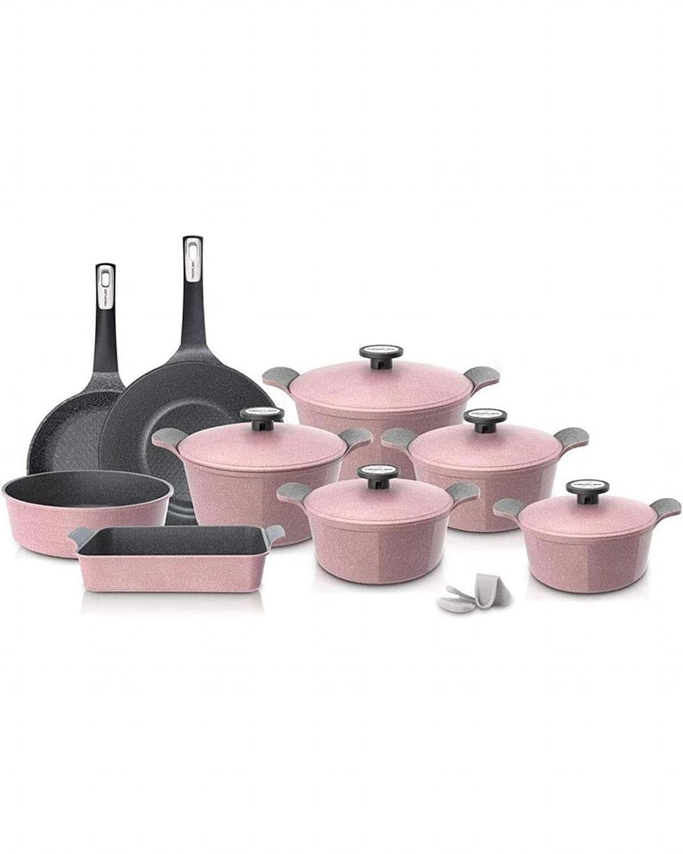 تغطية شاملة للمطبخ: 14 قطعة توفر لكِ كل الحلل والمقالي التي قد تحتاجينها في الاستخدام اليومي أو العزومات الكبرى.